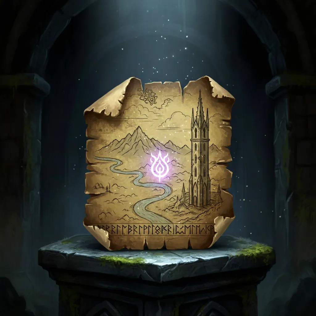 一张布满污渍和折痕的羊皮纸残片,只能看到上面绘制着模糊的河流和一座高塔的尖顶。单独看毫无价值,但也许能与某些线索拼凑起来。